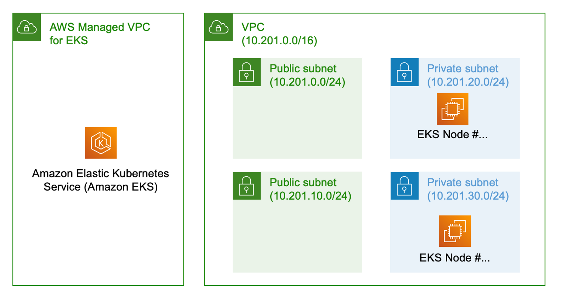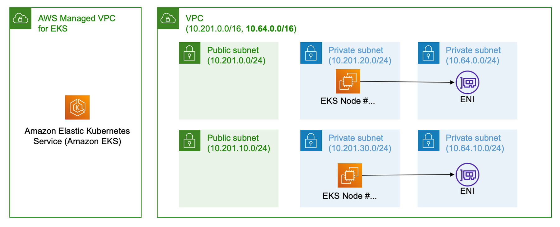 자 우선 위와 같은 구성의 EKS Cluster가 있다고 가정해 보겠습니다. 현재 저의 VPC는 10.201.0.0/16대역입니다. EKS의 Pod는 VPC CNI에 의해 VPC IP를 직접적으로 사용합니다. 따라서 VPC의 IP가 부족해지면 더이상 Pod가 Provisioning되지 않습니다.