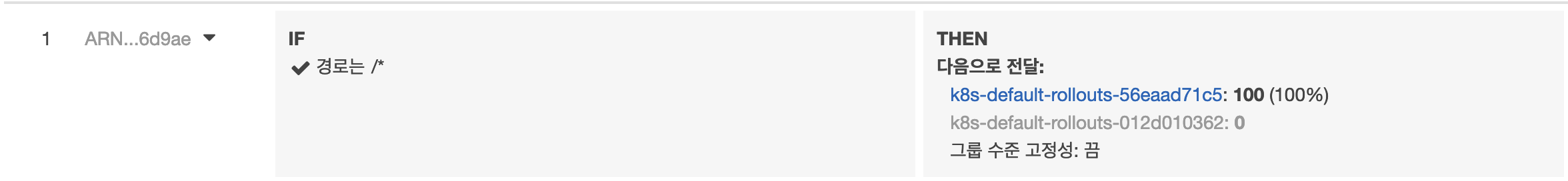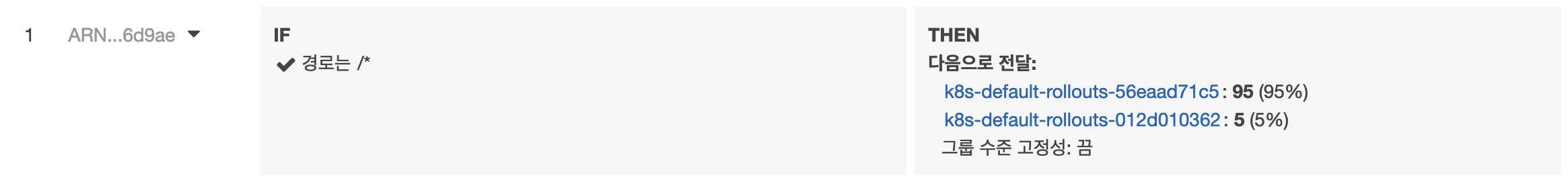 └──□ rollouts-demo-687d76d795-cwtx8 Pod ✔ Running 9m8s ready:1/1위처럼 KIND에 Rollout이라고 배포가 되었다. SetWeight를 5로 주었다. canary로 배포되기 때문에 가중치가 변경되었을 것이다. alb의 규칙이 정상적으로 변경되었는지 확인해보자