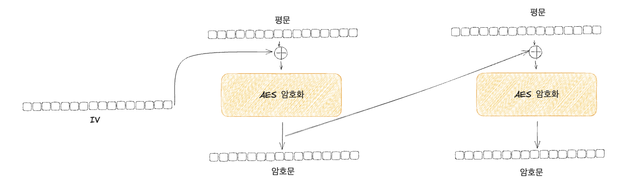 따라서 실제 업무에서는 IV(Initialization Vector)라는 임의의 값을 추가하여 무작위 암호화 하기위한 CBC를 사용한다. 이 알고리즘 또한 물론 XOR연산이 들어간다. 16바이트의 IV를 만들어서 평문의 첫 16바이트와 XOR 연산을 하여 무작위 하기 때문에 동일한 평문을 두번 암호화 해도 IV가 다르다면 다른 결과가 나온다. 만약 평문이 더 길다면 그 뒤에도 동일하게 IV와 XOR 연산을 한다.