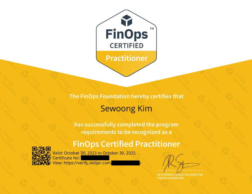오랜만에 자격증 취득 후기로... CKS나 CCNA, SAFe등 대기열에 있는 자격증이 좀 있지만 우선 최근에 많은 IT기업에서 찾는 FinOps를 먼저 공부해 보았다. 게다가 회사가 FinOps Foundation이랑 뭔가 관계가 생기기도 하여 자격증에 관심이 생기기도...(사실 커뮤니티 가입하려니까 자격증 없다고 까여서 화김에 결제했다.)