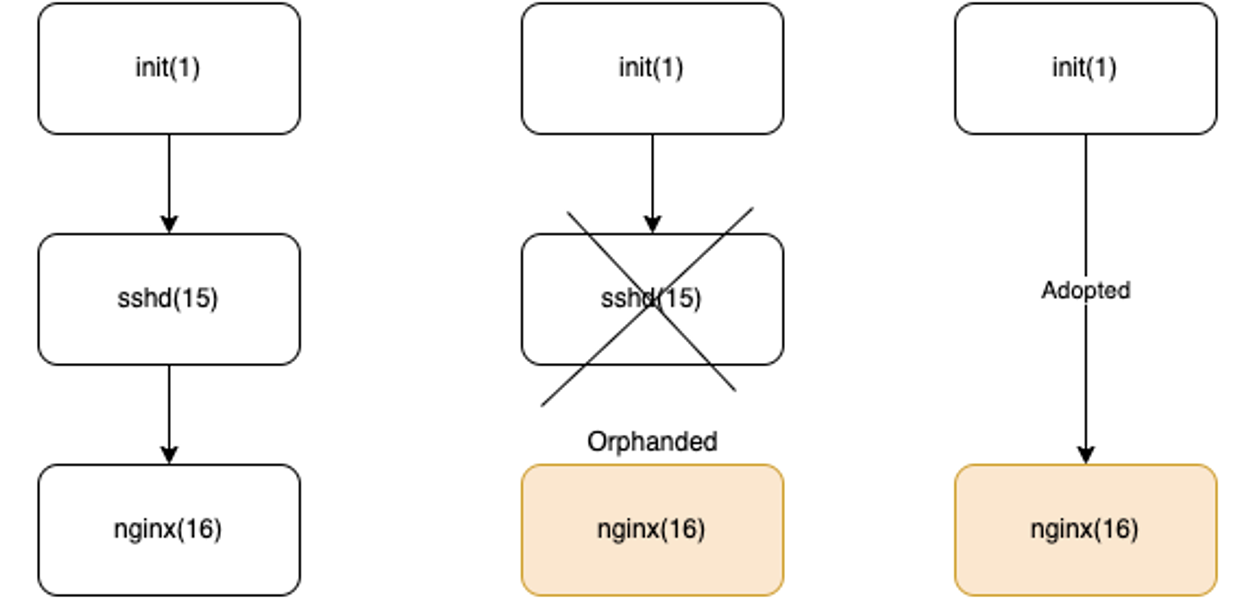 리눅스의 Process는 init 프로세스와 함께 시작됩니다. Container의 프로세스를 sh 커멘드를 통해 실행시키는 경우 init(1), sh(2), main_process(3) 형태로 PID가 부여되며 부모 프로세스가 자식 프로세스를 reaping하여 관리합니다. 따라서, 아래와 같이 의도치 않은 프로세스의 종료로 좀비 프로세스가 발생하면 고아 상태의 자식 프로세스를 거두는 것(adopt)으로 좀비 프로세스를 방지하거나 정리합니다.