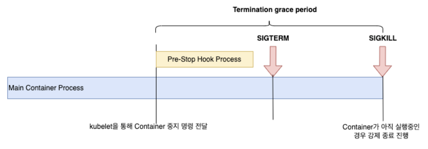 이 둘은 각각 프로세스를 강제 종료(SIGKILL)하거나 프로세스에게 종료 신호(SIGTERM)을 보내는 역할을 한다. 자 그러면 컨테이너는 종료시 어떻게 되느냐...보통 아래와 같이 수행된다(대다수의 컨테이너 오케스트레이션은 아래와 같은 프로세스 후에 종료가 이루어진다.