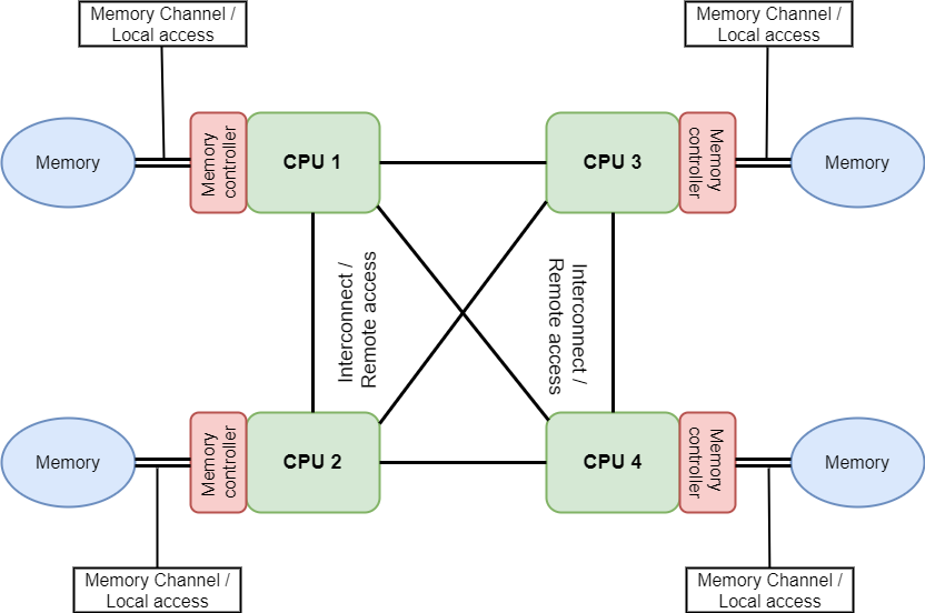 그래서 이를 개선하기위해 NUMA라는 아키텍쳐가 나왔습니다. 이는 각 CPU가 독립적인 지역 메모리 공간을 가지고 있어서 빠르게 메모리에 접근 할 수 있습니다. 따라서 모든 프로레스가 로컬 메미로에 동시 접근하기에 병목은 발생하지 않습니다. 다만 다른 Node의 메모리에 접근하게 되면 링크를 통해 메모리에 접근하기 때문에 성능이 일부 떨어 질 수 있습니다.