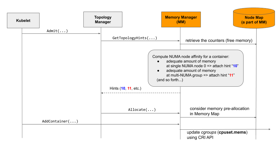 The Memory Manager is a Hint Provider, and it provides topology hints for the Topology Manager which then aligns the requested resources according to these topology hints. It also enforces cgroups (i.e. cpuset.mems) for pods. The complete flow diagram concerning pod admission and deployment process is illustrated in Memory Manager KEP: Design Overview and below: