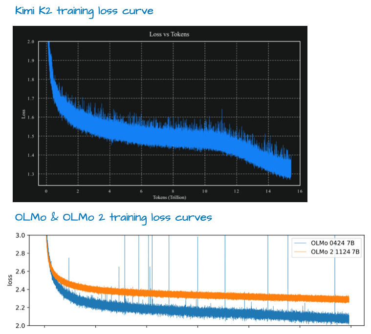 사람들은 손실 곡선이 예외적으로 매끄럽다고 언급했지만(스파이크가 없기 때문), 저는 그렇게 예외적으로 매끄럽지 않다고 생각합니다(예: 아래 그림의 OLMo 2 손실 곡선을 참조; 또한 기울기의 L2 노름이 훈련 안정성을 추적하는 더 나은 지표일 것입니다). 그러나 손실 곡선이 얼마나 잘 감소하는지가 정말 놀랍습니다.