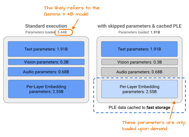 아래 그림은 PLE 메모리 절감 효과를 보여줍니다. 표준 Gemma 3 모델의 파라미터 수는 54억 4천만 개로 표시되어 있습니다. 이는 아마도 Gemma 3 40억 변형을 가리키는 것으로 추정됩니다.