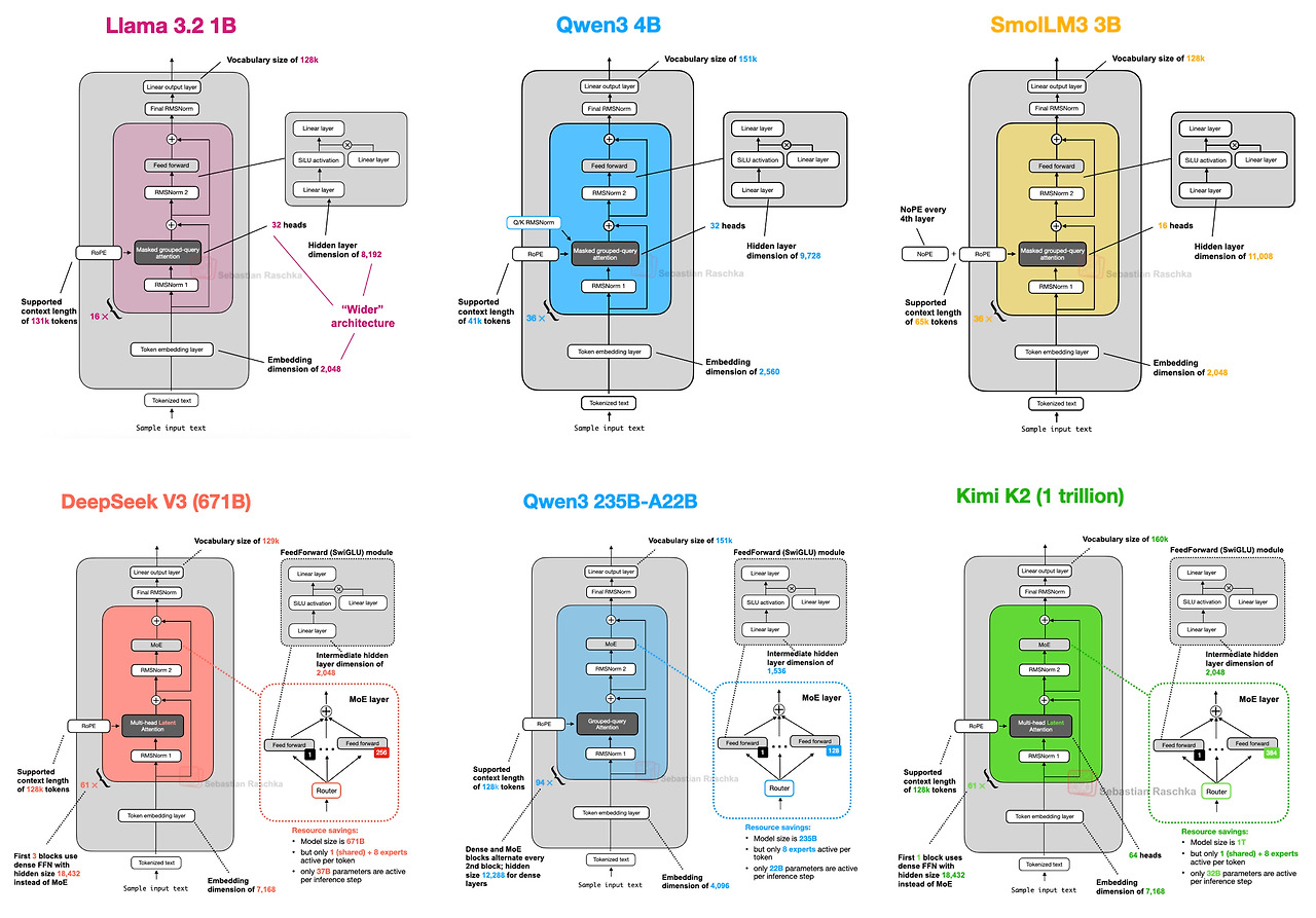 따라서, 이 기사에서는 벤치마크 성능이나 훈련 알고리즘에 대해 논의하는 대신, 오늘날의 플래그십 오픈 모델을 정의하는 아키텍처적 발전에 초점을 맞출 것입니다.