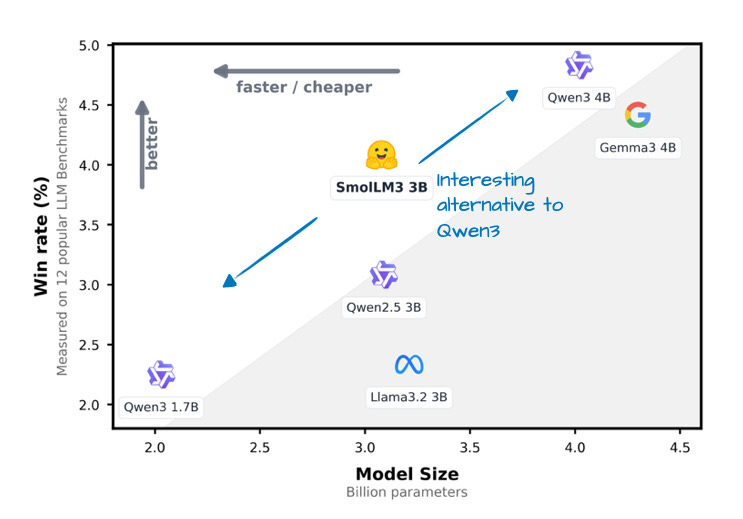 SmolLM3는 이 기사에서 다룬 다른 LLMs에 비해 그렇게 인기가 많지는 않지만, 상대적으로 작은 30억 파라미터 모델 크기임에도 불구하고 우수한 모델링 성능을 보여주기 때문에 포함할 가치가 있다고 생각했습니다. 이 모델은 아래 그림에서 볼 수 있듯이 1.7B와 4B Qwen3 모델 사이의 중간 위치에 있습니다.