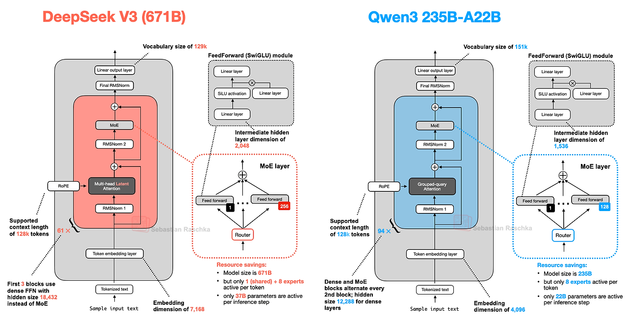 여기서는 2025년에 출시된 아키텍처에 초점을 맞추고 있지만, DeepSeek V3는 DeepSeek R1이 2025년에 출시된 이후에야 널리 주목받고 채택되기 시작했기 때문에 포함하는 것이 적절하다고 생각합니다.