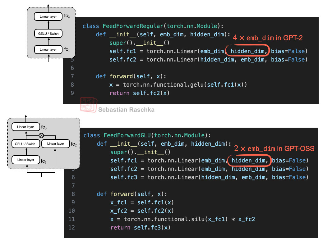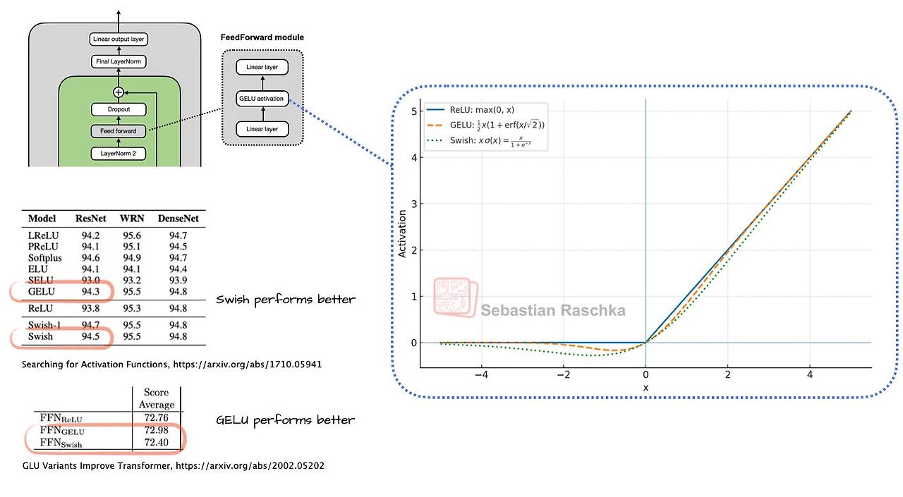 초기 GPT 아키텍처는 GELU를 사용했습니다. 왜 이제 GELU 대신 Swish를 사용하나요? Swish는 계산적으로 약간 더 저렴한 것으로 간주되며, 제 생각에는 그게 전부입니다. 어떤 논문을 보느냐에 따라 모델링 성능 측면에서 어느 쪽이 다른 쪽보다 약간 더 낫다는 것을 알 수 있습니다. 제 생각에는 이러한 작은 차이는 아마도 표준 오차 범위 내에 있으며, 하이퍼파라미터 민감도에 따라 마일리지가 달라질 수 있습니다.