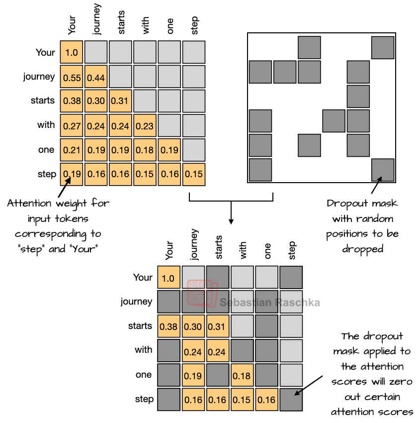 드롭아웃 (2012)은 훈련 중에 레이어 활성화 또는 주의 점수(그림 3)의 일부를 무작위로 "드롭아웃"(즉, 0으로 설정)하여 과적합을 방지하는 전통적인 기법입니다. 그러나 최신 LLM에서는 드롭아웃이 거의 사용되지 않으며, GPT-2 이후 대부분의 모델에서는 드롭아웃이 사라졌습니다(말장난 의도는 없습니다).