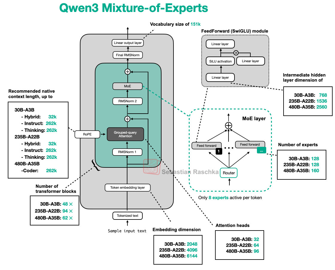 원본 Qwen3 모델에는 추론 모드를 활성화/비활성화하는 토글(토큰화기에서 enable_thinking=True/False 설정으로, <think></think> 태그를 추가하여 추론 행동을 비활성화합니다)이 있습니다. 그러나 Qwen3 팀은 최근 몇 주 동안 모델을 업데이트하고 하이브리드 모델에서 전용 Instruct/Thinking/Coder 변형으로 전환했습니다.