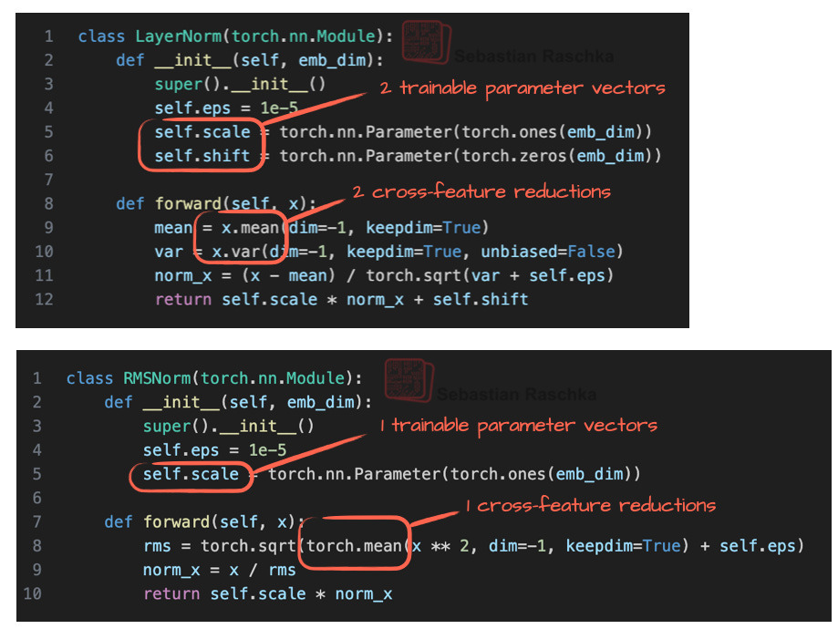 마지막으로, GPT-2에서 도입된 작은 개선 사항 중 하나는 LayerNorm (2016)을 RMSNorm (2019)로 대체하는 것입니다. 이는 최근 몇 년간 일반적인 트렌드가 되었습니다.