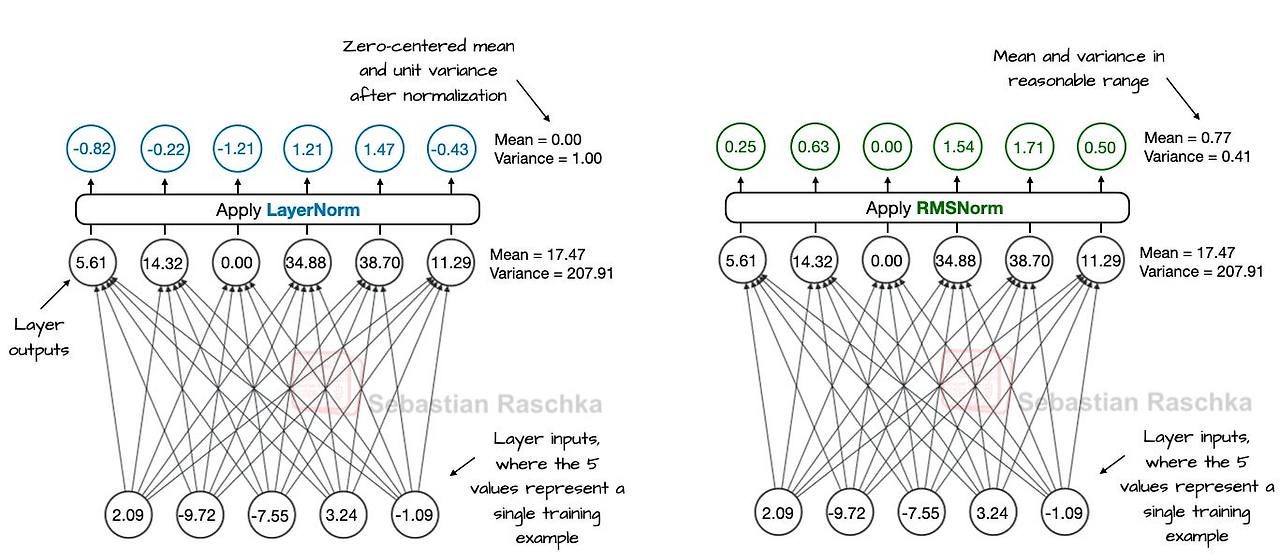 LayerNorm과 RMSNorm 모두 활성화 스케일을 안정화하고 최적화를 개선하지만, 계산 비용이 더 저렴하기 때문에 대규모 LLM에서는 RMSNorm이 선호되는 경우가 많습니다. LayerNorm과 달리 RMSNorm은 편향(시프트) 항이 없으며 값비싼 평균 및 분산 계산을 단일 루트-평균 제곱 연산으로 줄입니다. 따라서 교차 기능 감소 횟수가 2개에서 1개로 줄어들어 GPU의 통신 오버헤드가 감소하고 학습 효율성이 향상됩니다.