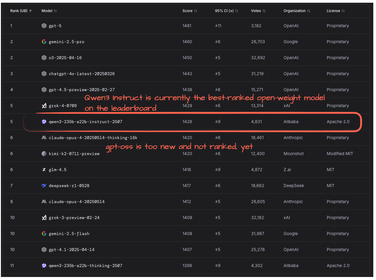 이 모델은 아직 독립적인 벤치마크를 하기에는 너무 새롭습니다. 확인LM 아레나 리더보드를 검색해 보니 아직 gpt-oss가 목록에 없는 것을 발견했습니다. 따라서 LM 아레나의 사용자에 따르면 현재로서는 Qwen3-Instruct가 오픈 웨이트 모델 중 가장 높은 순위를 유지하고 있습니다(그림 22).