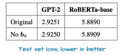 GPT-2 시대 이후로 이러한 편향 유닛이 사용되는 것을 본 적이 없으며, 일반적으로 불필요한 것으로 여겨지고 있습니다. 실제로 최근 논문을 통해 수학적으로 이 사실이 최소한 키 변환(k_proj)에 대해 성립한다는 것이 입증되었습니다. 또한 실증적 결과는 편향 유닛을 사용하든 사용하지 않든 간에 거의 차이가 없다는 것을 보여줍니다(아래 그림 19 참조).