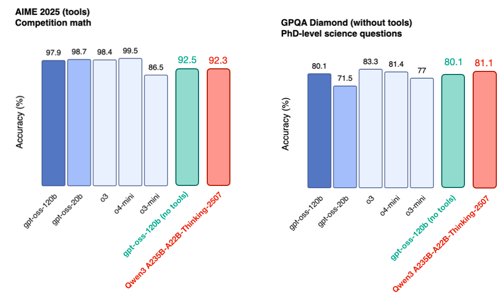 그러나 이 점은 gpt-oss-120b가 Qwen3 A235B-A22B-Thinking-2507 모델의 거의 절반 크기이며 단일 GPU에서 실행 가능하다는 점을 고려해야 합니다.