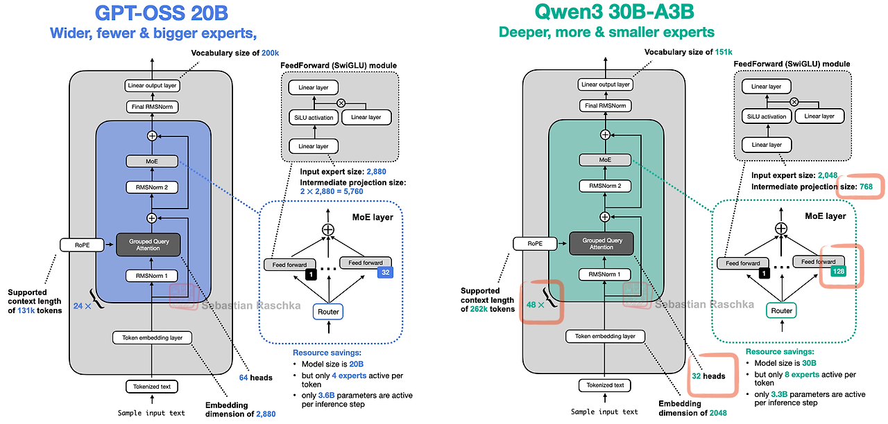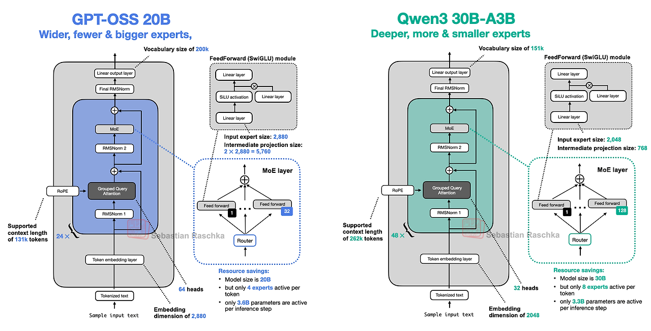 위 그림 14에서 볼 수 있듯이, gpt-oss는 예상외로 적은 수의 MoE(32명 대신 128명)를 보유하고 있으며, 토큰당 활성화된 Epxert도 8명 대신 4명만 사용합니다. 그러나 각 전문가는 Qwen3의 전문가보다 훨씬 더 큽니다.