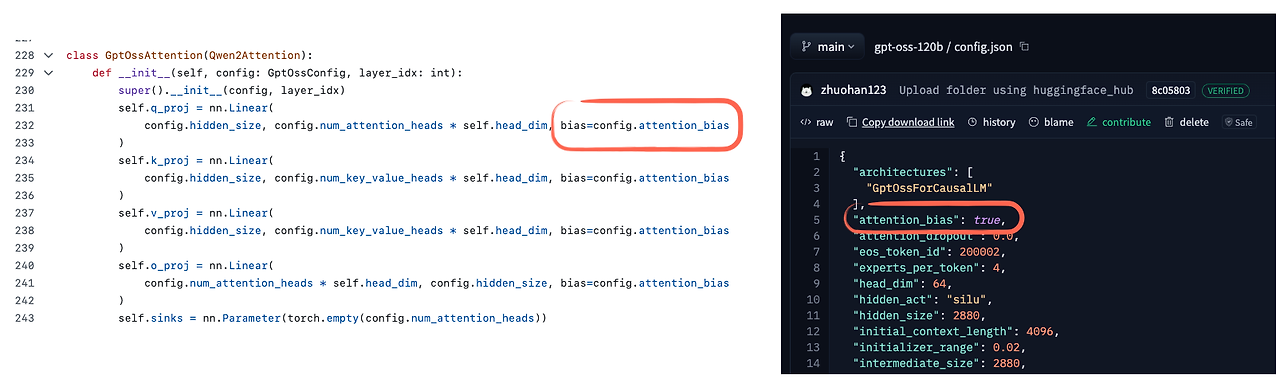 하지만 한 가지 흥미로운 세부 사항이 눈에 띄었습니다. 아래 그림에서 볼 수 있듯이 gpt-oss는 주의력 가중치에 바이어스 단위를 사용하는 것 같습니다.