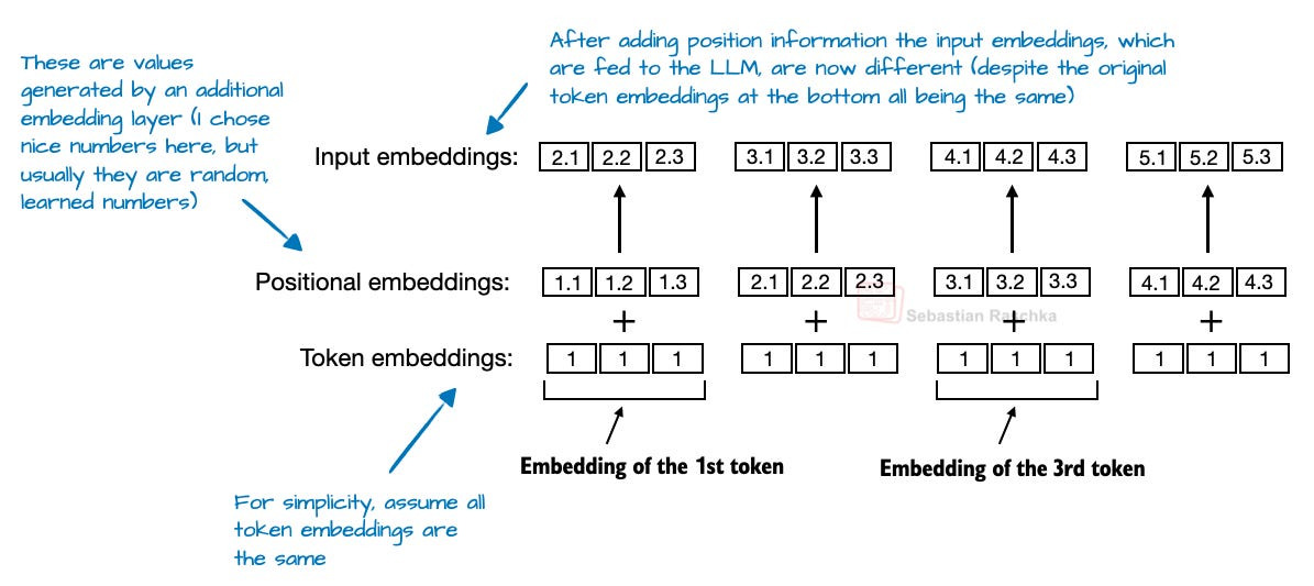 트랜스포머 기반 LLM에서는 주의 메커니즘으로 인해 위치 인코딩이 필요합니다. 기본적으로 주의는 입력 토큰을 순서가 없는 것처럼 취급합니다. 원래 GPT 아키텍처에서 절대 위치 임베딩은 시퀀스의 각 위치에 대해 학습된 임베딩 벡터를 추가한 다음 토큰 임베딩에 추가하는 방식으로 이 문제를 해결했습니다(그림 4).