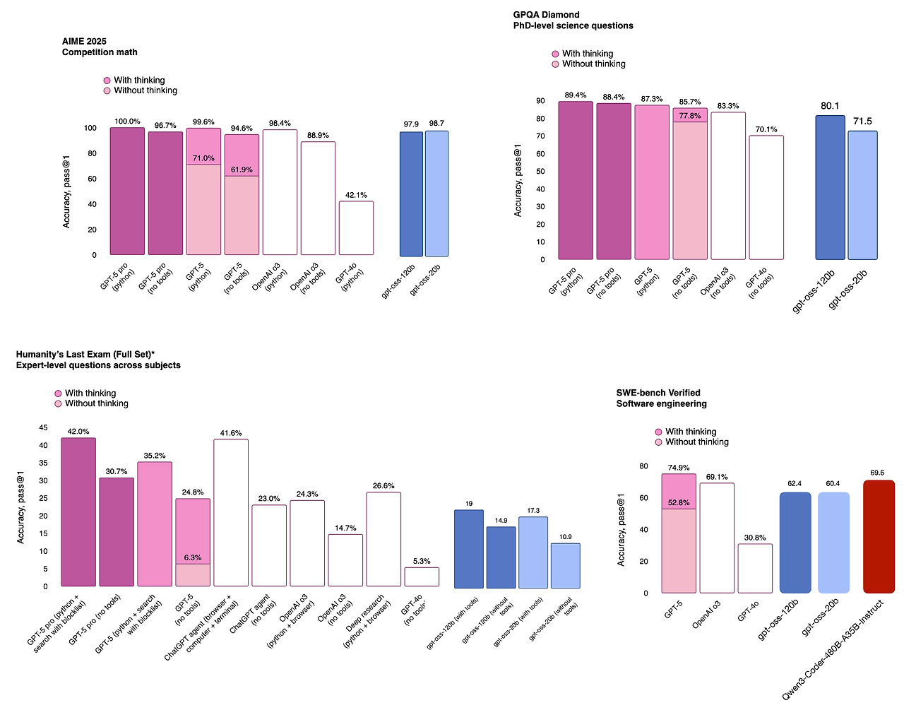 OpenAI는 바쁜 한 주를 보냈고, gpt-oss 직후 오랫동안 기다려온 GPT-5 모델을 출시했습니다. GPT-5 출시는 흥미로웠습니다. 여기서 한 가지 말씀드리고 싶은 것이 있다면, 오픈 소스 모델이 벤치마크 성능 측면에서 최고의 제품과 비교했을 때 얼마나 뛰어난지 정말 놀랐다는 것입니다(그림 24).