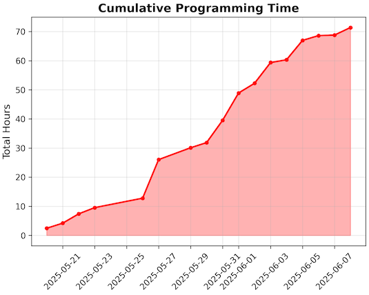 이 프로젝트에 약 4주를 보냈는데, 대부분은 여행 중이거나 뇌진탕에서 회복하는 동안이었습니다. 여러분 중 한 명은 훨씬 더 짧은 개발 시간으로 빠르게 실행할 수 있겠지만, 맥락을 위해 제가 소요한 시간을 소개합니다.