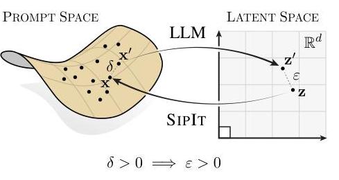 그림 1: LLM에서 프롬프트 공간에서 잠재 공간으로의 단사 매핑을 보여주는 개념적 개요. 저자들은 서로 다른 프롬프트(프롬프트 공간의 점으로 표시됨)가 고차원 잠재 공간의 서로 다른 점으로 매핑되며, 그들의 SIPIT 알고리즘이 이러한 표현으로부터 원래 프롬프트를 복구할 수 있음을 증명합니다.