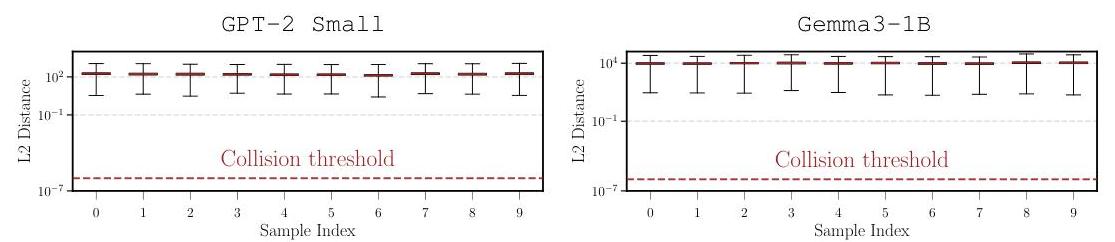 저자들은 6가지 주요 LLM(GPT-2(Small/Medium/Large), Gemma-3(1B/4B/12B), Llama-3.1-8B, Mistral-7B-v0.1, Phi-4-mini-instruct, TinyStories-33M)에 걸쳐 수십억 건의 쌍별 충돌 테스트를 수행했습니다. 다양한 데이터셋(Wikipedia, C4, The Pile, Python GitHub 코드)에서 샘플링한 100,000개의 프롬프트를 사용하여, 충돌 임계값 $10^{-6}$으로 마지막 토큰 표현 간의 최소 L2 거리를 측정했습니다.