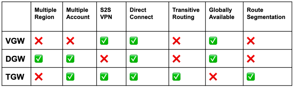 - AWS Direct Connect Gateway(DWS, 이전에는 VGW-virtual private gateway) VS Transit Gateway(TGW)