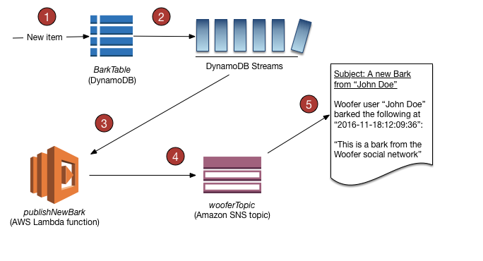 테이블에서 DynamoDB 스트림을 활성화하면 스트림 ARN을 작성한 Lambda 함수와 연결할 수 있습니다. 테이블의 항목이 수정 된 직후 테이블의 스트림에 새 레코드가 나타납니다. AWS Lambda는 스트림을 폴링하고 새 스트림 레코드를 감지하면 Lambda 함수를 동기식으로 호출합니다. Lambda 함수는 알림 보내기 또는 워크 플로 시작과 같이 지정한 모든 작업을 수행 할 수 있습니다.