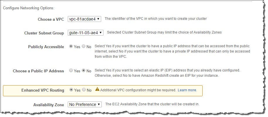 이러한 기능을 사용하여 Amazon Redshift 클러스터와 다른 리소스 간의 데이터 흐름을 엄격하게 관리합니다. Enhanced VPC Routing을 사용하여 VPC를 통해 트래픽을 라우팅 할 때 VPC 흐름 로그를 사용하여 COPY 및 UNLOAD 트래픽을 모니터링 할 수도 있습니다. Enhanced VPC Routing이 활성화되지 않은 경우 Amazon Redshift는 AWS 네트워크 내의 다른 서비스에 대한 트래픽을 포함하여 인터넷을 통해 트래픽을 라우팅합니다.