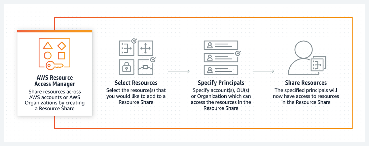 AWS Resource Access Manager (RAM)는 AWS 계정 또는 AWS 조직 내에서 AWS 리소스를 쉽고 안전하게 공유 할 수있는 서비스입니다. AWS Transit Gateway, 서브넷, AWS License Manager 구성 및 Amazon Route 53 Resolver 규칙 리소스를 RAM과 공유 할 수 있습니다.