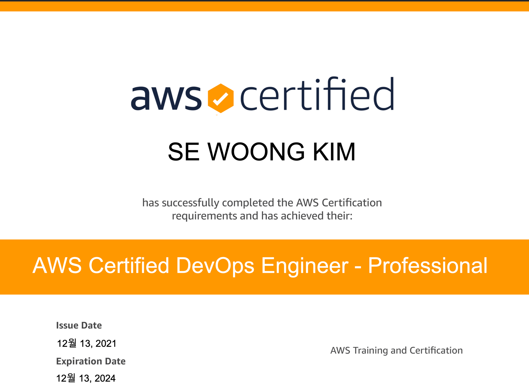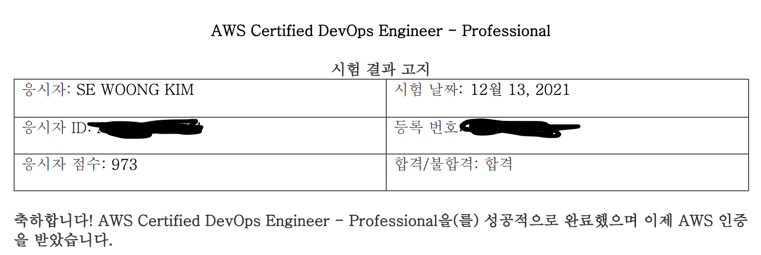 Developer 부터 SysOps 그리고 마지막으로 DevOps까지 전부 취득했다. 2021년 마지막을 장식하는 자격증으로 한번에 합격해서 행복한 크리스마스를 보낼것 같다.