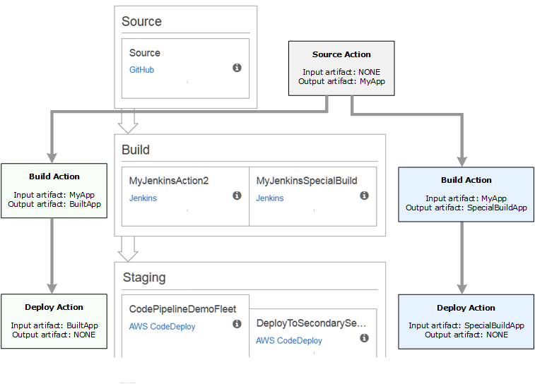 위처럼 빌드, 배포후 테스트나 승인에 거쳐 운영 환경에 배포되는 파이프라인도 가능하고