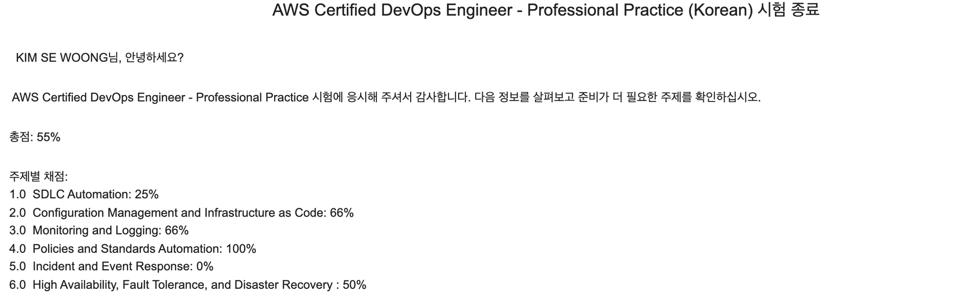 실제로 핸즈온한 뒤에 유데미의 모의고사를 보았는데 70~80%의 정답률을 기록했다. 그만큼 핸즈온 커리큘럼이 DevOps와 딱 들어맞는다. 그리고 중간중간 읽어야할 백서나 도큐먼트, 블로그등을 알려주기에 수시로 에세이 읽듯 읽었다. 사실 실무에 도움되는 내용도 많기에 적극 권장한다.
