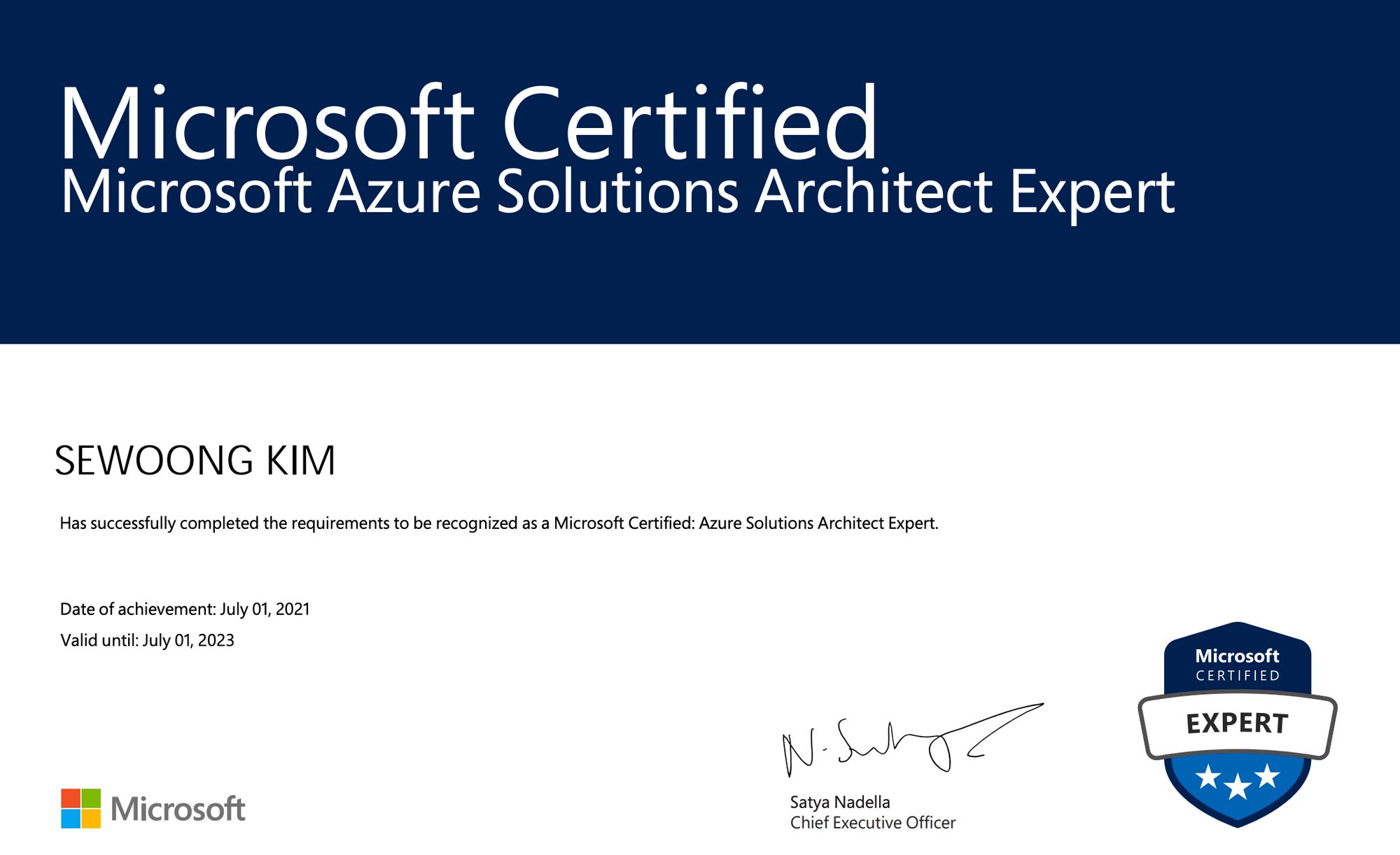 2021년 7월 1일에 AZ-304 합격으로 Expert자격증이 발급되었다. 2021년 6월 인가 7월 기점으로 Azure의 모든 인증서의 유효기간을 1년으로 줄어들었고 대신 만료 6개월 이전 갱신 시험을 볼 수 있다고 듣긴 했다.