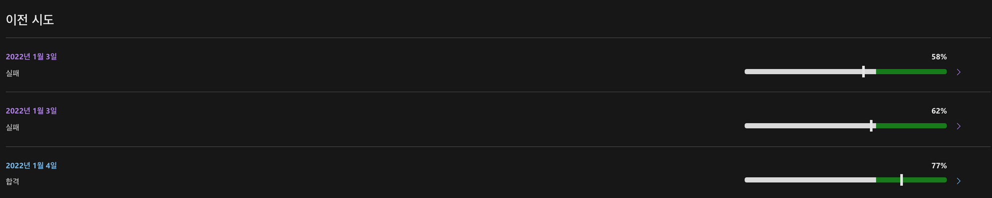 보면 알겠지만 평가에 응시할 수 있는 대상과 함께 시간이 나온다. 현재 갱신에 성공하여 362일 하고 24시간 후에 갱신 시험을 다시 응시 할 수 있게 되었다.