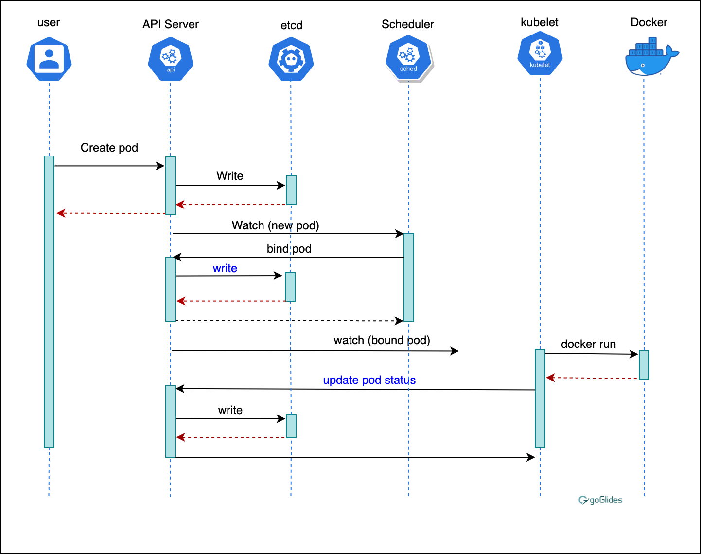CKA 시험을 준비하는 이들이라면 무조건 봐야 하는 바이블 같은 강의다. 위 강의에서의 내용으로는 API를 호출하면 우선 ETCD에 저장부터 되고 내부 스케쥴러를 호출하여 API를통해 각 Node의 Kubelet에 명령을 전달하는 형태다.