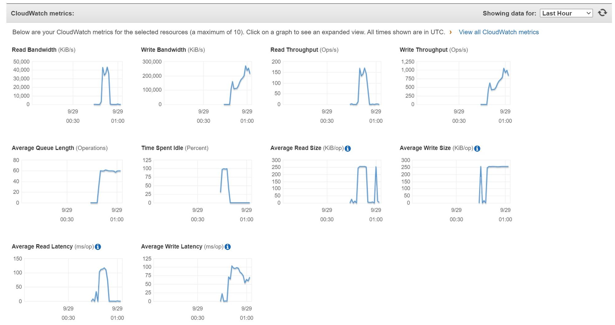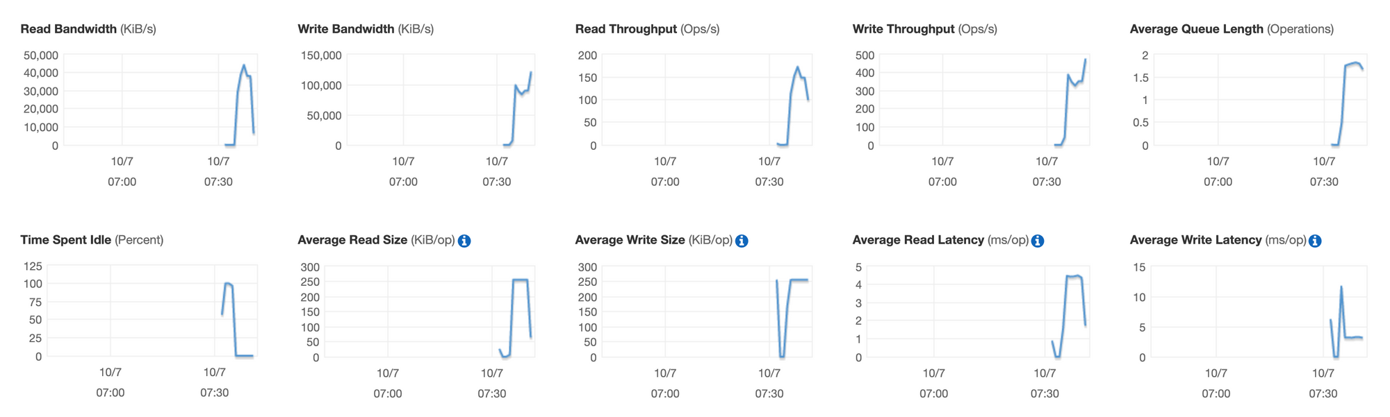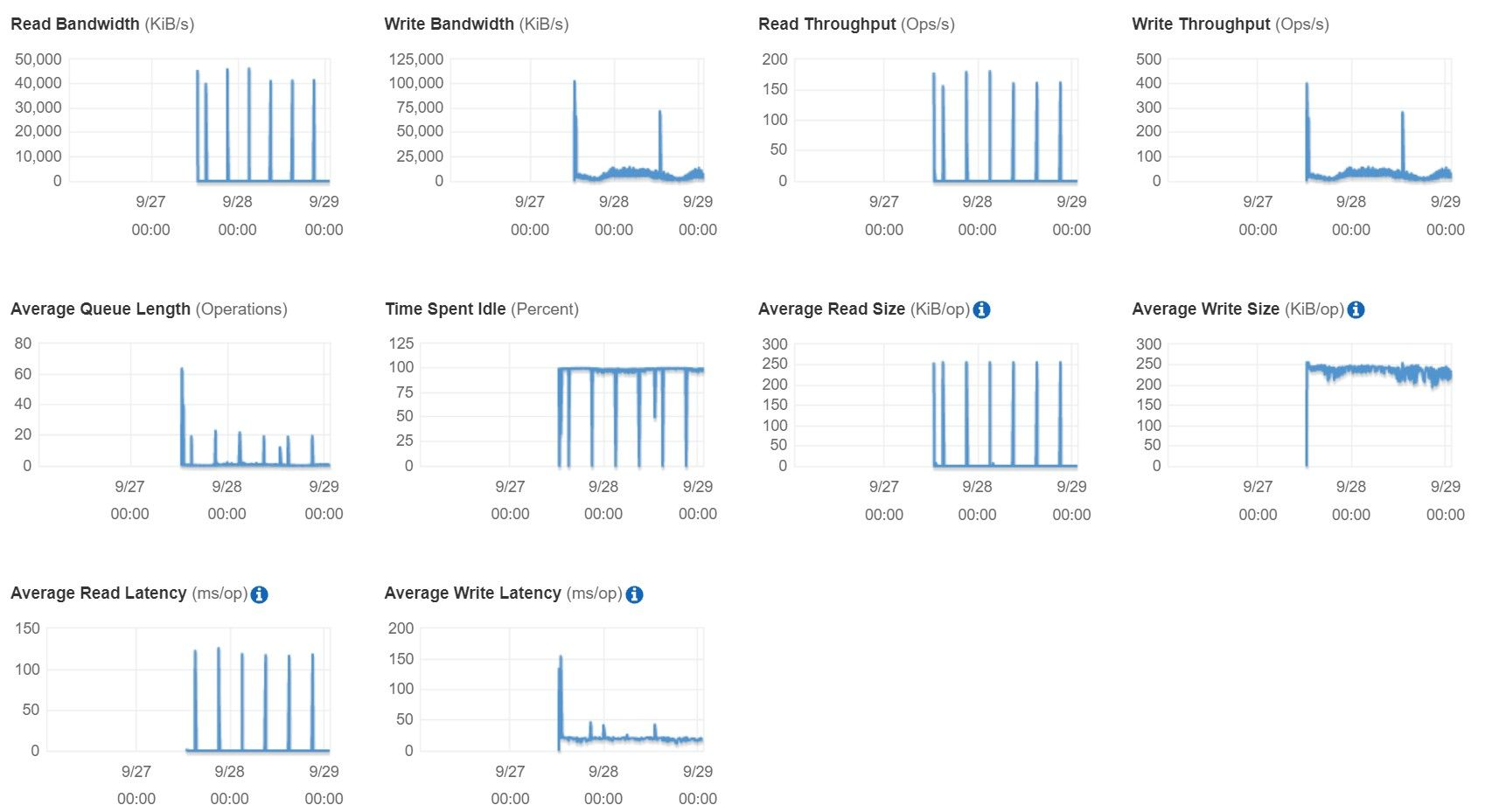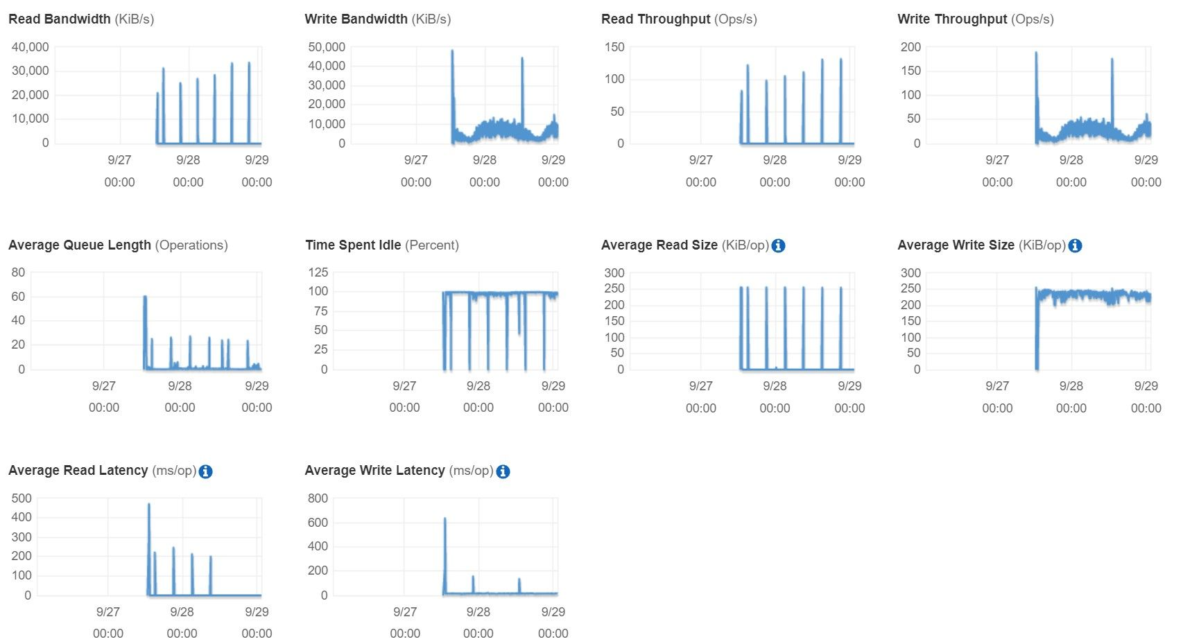 EBS 자체 성능 제한으로 Read/Write Size의 지표는 같으나 Write Bandwidth와 Write Throughput의 성능이 눈에띄게 달라졌다. EBS문제는 확실하긴 하다.