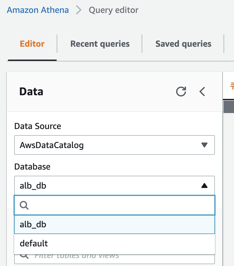 생성이 완료 되면 이처럼 Athena의 콘솔에서 데이터베이스를 선택할 수 있다.