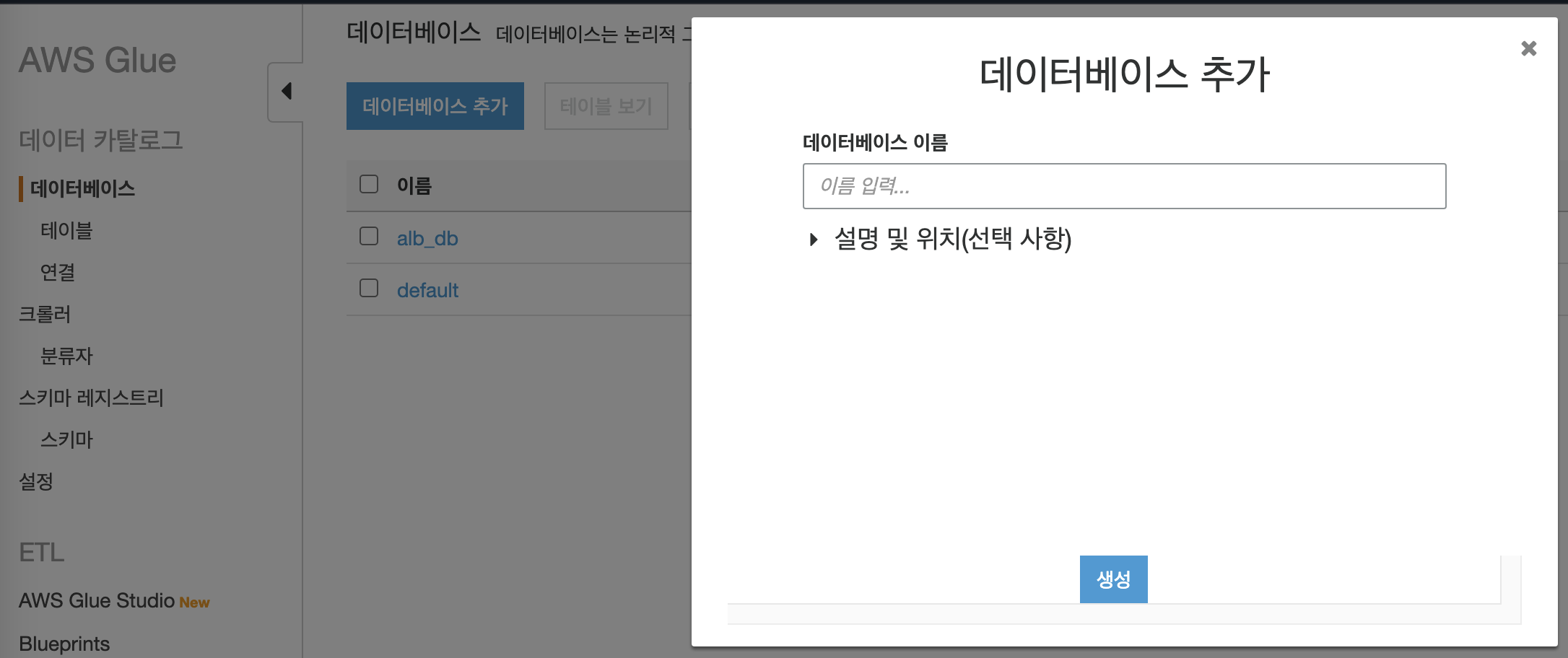 나는 그냥 Glue에서 데이터베이스를 생성했다.