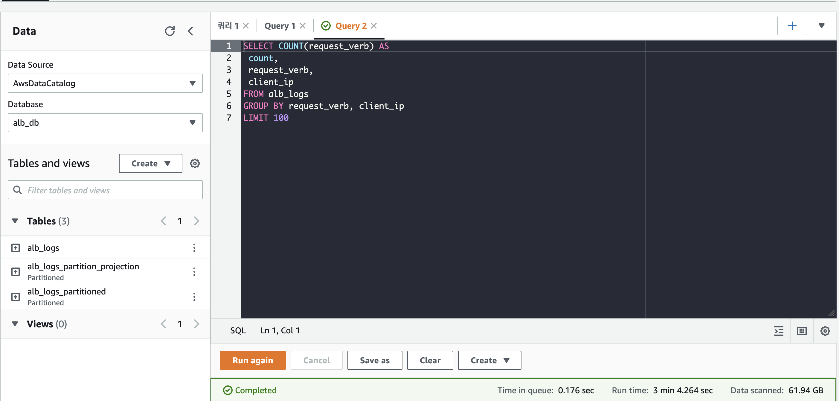 ALB AccessLog의 포맷에 맞게 컬럼을 지정해주고 테이블을 생성해준다. 근데 중요한건 이렇게 만들어진 테이블은 파티셔닝이 되어 있지 않다는 점이다. 쿼리하면 풀스캔이 되고 스캔한 데이터에 알맞게 돈이 매우 많이 과금된다. 참고로 저거 만들고 실수로 쿼리 실행했는데 60테라를 스캔해버려서...다음달에 300달러가 추가 과금될 예정이다.