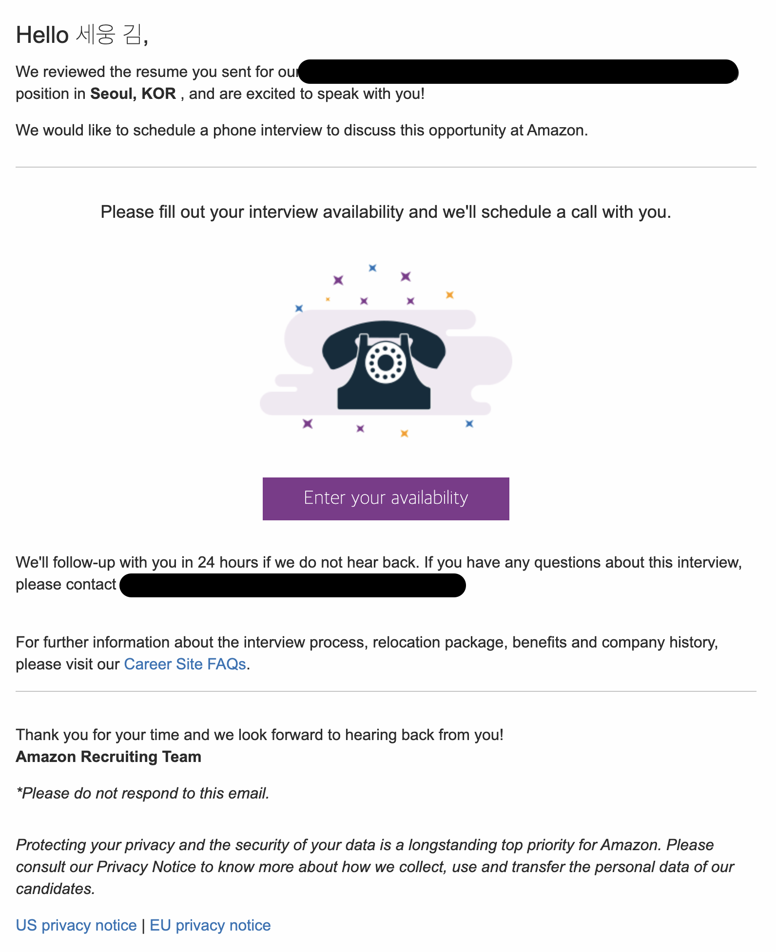 한국식으로 따지면 1차 면접(기술면접) 일정을 잡는것이다. 일정을 잡고 나면 확정 메일이 온다. 인터뷰는 코시국이라 chime으로 진행했다.
