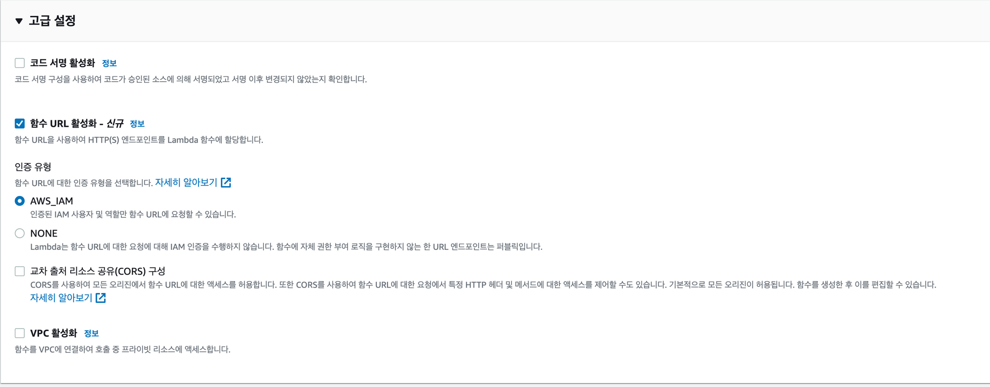 기존에 API Gateway나 ALB를 이용해 호출하던게 자체적으로 Domain을 가지게 된것이다. 물론 API gw나 ALB를 사용한다면 보안성이 좀더 높아질 것이다. WAF연동도 가능하고 기타 헤더조건을 활용한 접근 제한등 다양한 것을 활용 할 수 있기 때문. 물론, 함수 URL을 사용할때도 몇가지 인증 유형을 지원한다