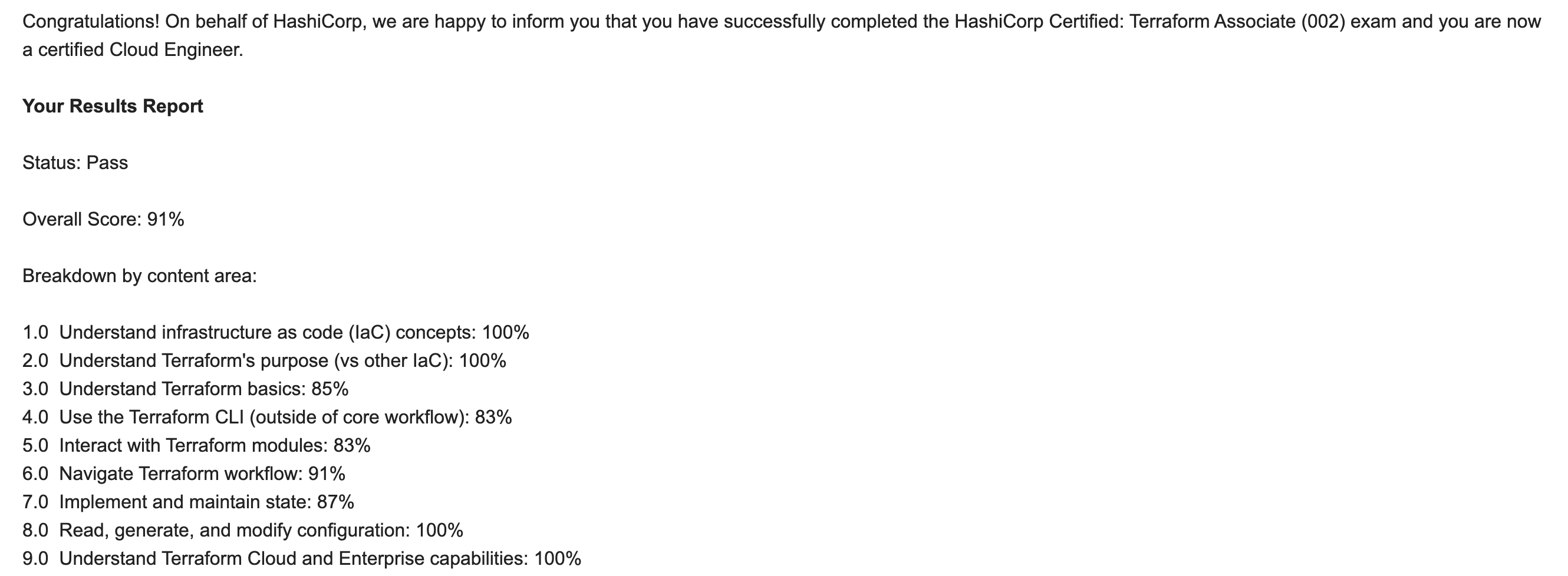 나쁘지 않은 점수다. Certification PDF는 Hashicorp가 아닌 Credly에서 받아야한다. 정말 어디서 받는지 몰라서 문의 메일 보내고 한참을 찾았다.